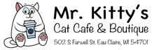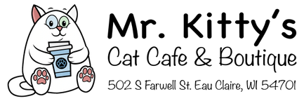Mr. Kitty's Cat Cafe features a rotating selection of 15-20 adoptable cats in our dedicated cat lounge, all sourced from our esteemed partner, the Eau Claire Community Humane Association (ECCHA).